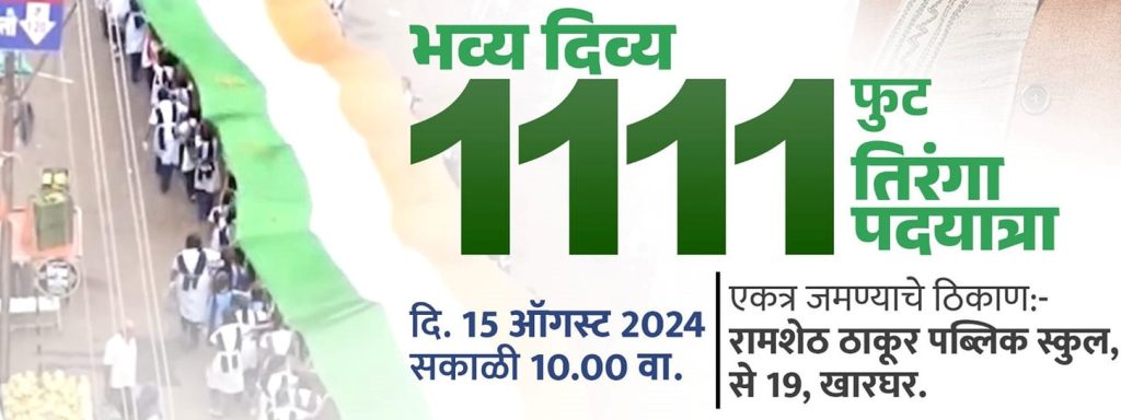 खारघरमध्ये भव्य दिव्य तिरंगा पदयात्रेचे आयोजनपनवेल दि.१४: भारतीय स्वातंत्र्य दिनानिमित्त आमदार प्रशांत ठाकूर यांच्या मार्गदर्शनाखाली भारतीय जनता पार्टीच्यावतीने खारघरमध्ये ‘भव्य दिव्य ११११ फुट तिरंगा पदयात्रा’ आयोजित करण्यात आली आहे. विशेष म्हणजे रायगड जिल्ह्यात प्रथमच सर्वात मोठी हि तिरंगा पदयात्रा असणार आहे.‘विकसित भारत’ वर लक्ष केंद्रित करून आपला भारत देश ७८ वा स्वातंत्र्यदिन साजरा करणार आहे. … Continue reading जिल्ह्यात प्रथमच ११११ फुट तिरंगा पदयात्रा !