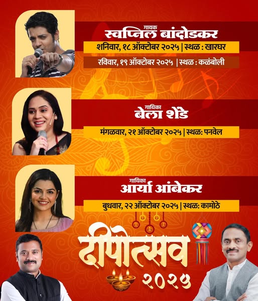 राष्ट्रीय पुरस्कार विजेती सुप्रसिद्ध गायिका आर्या आंबेकर, सुप्रसिद्ध गायक स्वप्नील बांदोडकर यांच्यासह अनेक गायकांच्या सुरेल मैफिलीपनवेल दि.१५: सुश्राव्य गाण्यांची सुरेल मैफिल असलेल्या ‘दिवाळी संध्या’ या सांस्कृतिक मेजवानीचे दरवर्षीप्रमाणे यंदाही आमदार…