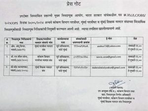 नवीमुंबई, दि.11 : भारत निवडणूक आयोगाने जाहीर केलेल्या मुंबई पदवीधर, कोकण विभाग पदवीधर, मुंबई शिक्षक मतदारसंघाच्या द्विवार्षिक निवडणूकीसाठी निवडणूक आयोगामार्फत मतदारसंघनिहाय निवडणूक निरिक्षकांची नियुक्ती करण्यात आली आहे. अशी माहिती उपआयुक्त (सा.प्र.)कोकण विभाग तथा सह. निवडणूक निर्णय अधिकारी अमोल यादव यांनी दिली.भारत निवडणूक आयोगाच्या प्रसिध्दी पत्रकानुसार दिनांक. 26 जून 2024 रोजी महाराष्ट्र विधान परिषदेच्या मुंबई पदवीधर,कोकण … Continue reading शिक्षक पदवीधर मतदारसंघासाठी निवडणूक निरिक्षकांची नियुक्ती !