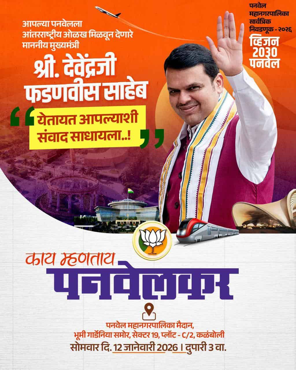पनवेलदि. ११: पनवेल शहराला आंतरराष्ट्रीय स्तरावर ओळख मिळवून देणारे राज्याचे लोकप्रिय मुख्यमंत्री देवेंद्र फडणवीस हे सोमवार दिनांक १२ रोजी दुपारी ३ वाजता कळंबोली येथे नागरिकांशी थेट संवाद साधणार आहेत. या वेळी ते ‘व्हिजन २०३० पनवेल’ ही संकल्पना मांडणार असून पनवेलच्या सर्वांगीण विकासाचा आराखडा नागरिकांसमोर सादर करणार आहेत.