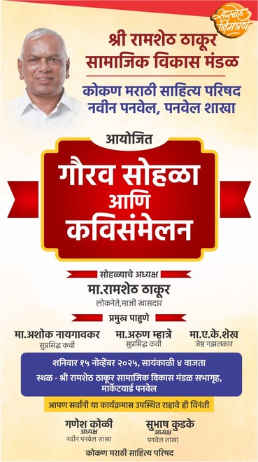 लोकनेते माजी खासदार रामशेठ ठाकूर यांच्या अध्यक्षतेखाली होणाऱ्या या समारंभासाठी महाराष्ट्रातील सुप्रसिद्ध हास्य कवी अशोक नायगावकर,सुप्रसिद्ध कवी अरुण म्हात्रे,ज्येष्ठ गझलकार ए.के.शेख आदी उपस्थित राहणार आहेत. शनिवार दि.१५ नोव्हेंबर २०२५ रोजी सायंकाळी ४ वाजता पनवेलच्या मार्केटयार्ड येथील श्री रामशेठ ठाकूर सामाजिक विकास मंडळ सभागृह येथे समारंभ संपन्न होणार आहे. या सोहळ्यात लोकनेते माजी खासदार यांनी आपल्या ७५ व्या वर्षात पदार्पण केल्याबद्दल त्यांचा सत्कार तसेच साहित्यिकांचा सत्कार आणि कवी संमेलन संपन्न होणार आहे.सहभागी कवींना प्रमाणपत्र आणि स्मृतीचिन्ह आयोजकांच्यावतीने दिले जाणार आहे,या सोहळ्यासाठी आपण सर्वांनी उपस्थित रहावे असे आवाहन कोकण मराठी साहित्य परिषद नवीन पनवेल शाखेचे अध्यक्ष गणेश कोळी,पनवेल शाखेचे अध्यक्ष सुभाष कुडके यांनी केले आहे.