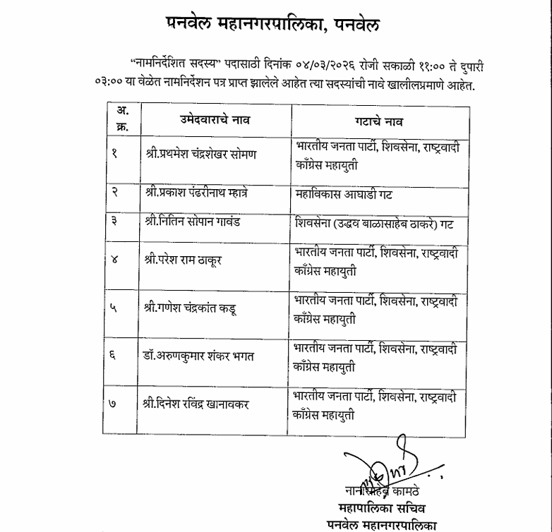 पनवेल दि.४: पनवेल महानगरपालिकेत स्वीकृत नगरसेवक पदासाठी बुधवारी आज सकाळी ११ ते दुपारी ३ या वेळेत उमेदवारी अर्ज दाखल करण्याची प्रक्रिया पार पडली. महापालिका सचिव तथा निवडणूक निर्णय अधिकारी नानासाहेब कामठे यांच्याकडे अर्ज स्वीकारण्यात आले. भाजप, शिवसेना, राष्ट्रवादी काँग्रेस पक्ष या महायुतीकडून परेश ठाकूर, गणेश कडू, डॉ. अरुणकुमार भगत, दिनेश खानावकर तसेच अॅड. प्रथमेश सोमण यांनी उमेदवारी अर्ज दाखल केले.