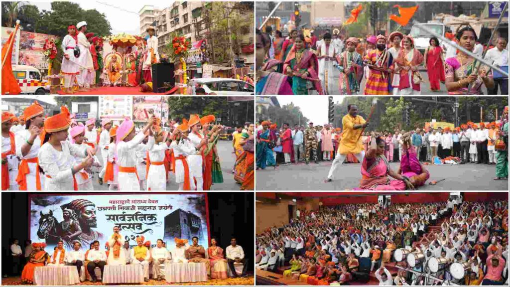 सकाळी 7 वाजता छत्रपती शिवाजी महाराजांच्या पुर्णाकृती अश्वारूढ पुतळ्यास मान्यवरांच्या हस्ते पुष्पहार अर्पण करून व महाराष्ट्र गीताच्या सादरीकरणा नंतर ढोल ताशाच्या गजरात भव्य – दिव्य अशा मिरवणूकीची सुरूवात झाली. या मिरवणूकीमध्ये पारंपारिक वेशभुषेमधील महिला, पुरुष, विद्यार्थी व विद्यार्थांनी उस्फूर्तपणे सहभाग घेतला. छत्रपती शिवाजी महाराजांच्या जीवन चरित्रांतील विविध प्रसंगाचे एकूण 7 चित्ररथ, महापालिकेच्या शाळा व खाजगी शाळा अशा विविध शाळांच्या विद्यार्थ्यांचे 14 लेझीम पथक, ढोल पथक, बॅन्जो पथक याचा समावेश होता. दांडपट्टा तलवारबाजी लेझीम अशा शिवकालीन मैदानी खेळांचे (पाच ठिकाणी ) सादरीकरण करण्यात आले. ही कला सादरीकरण करणाऱ्या कलावंतांनी उपस्थित शिवप्रेमींची मने जिंकली.