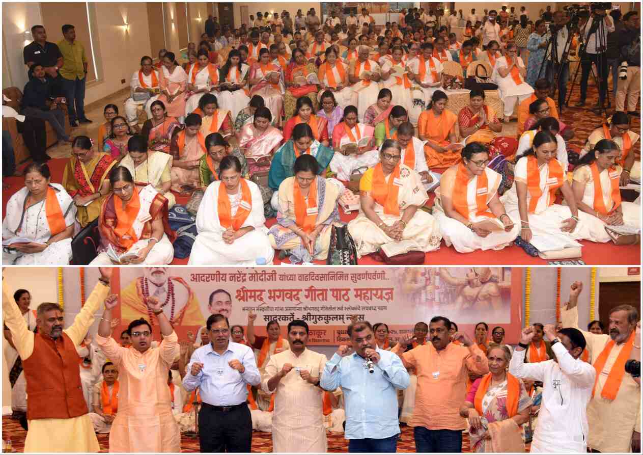 पनवेल दि.१७: लोकप्रिय पंतप्रधान नरेंद्र मोदी यांच्या वाढदिवसानिमित्त भारतीय जनता पार्टी पनवेल तालुका, संस्कार भारती पनवेल महानगर, संस्कृत भारती पनवेल यांच्या वतीने श्रीगुरुकुलम् न्यासतर्फे श्रीमद् भगवद गीता पाठ महायज्ञ उत्साहात संपन्न झाला. धार्मिक वातावरणात गीतेच्या श्लोकांचे पठण करून पंतप्रधान नरेंद्र मोदी यांना निरोगी दीर्घायुष्यासाठी, देश, राज्य व समाजाच्या कल्याणासाठी सामूहिक प्रार्थना करण्यात आली. या संस्कारमय कार्यक्रमाला भाजपचे प्रदेश अध्यक्ष आमदार रवींद्र चव्हाण यांची प्रमुख उपस्थिती लाभली. या महायज्ञाचे आयोजन पनवेलचे आमदार प्रशांत ठाकूर यांच्या सहकार्याने करण्यात आले होते.