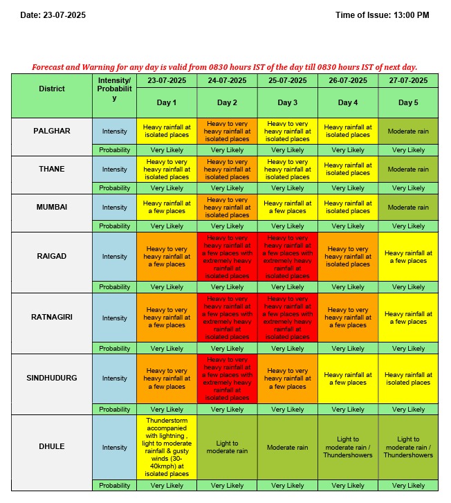 हवामान विभागाच्या अंदाजानुसार, २४ जुलैपासून रायगड, रत्नागिरी व सिंधुदुर्ग जिल्ह्यांत काही भागांत अतिवृष्टी होण्याची शक्यता “अत्यंत शक्य” असल्याचे नमूद करण्यात आले आहे. हे दिवस ‘रेड अलर्ट’ किंवा ‘धोक्याचा’ इशारा देणारे आहेत. या कालावधीत अतिवृष्टीबरोबरच काही ठिकाणी ढगफुटीच्या घटना घडू शकतात.